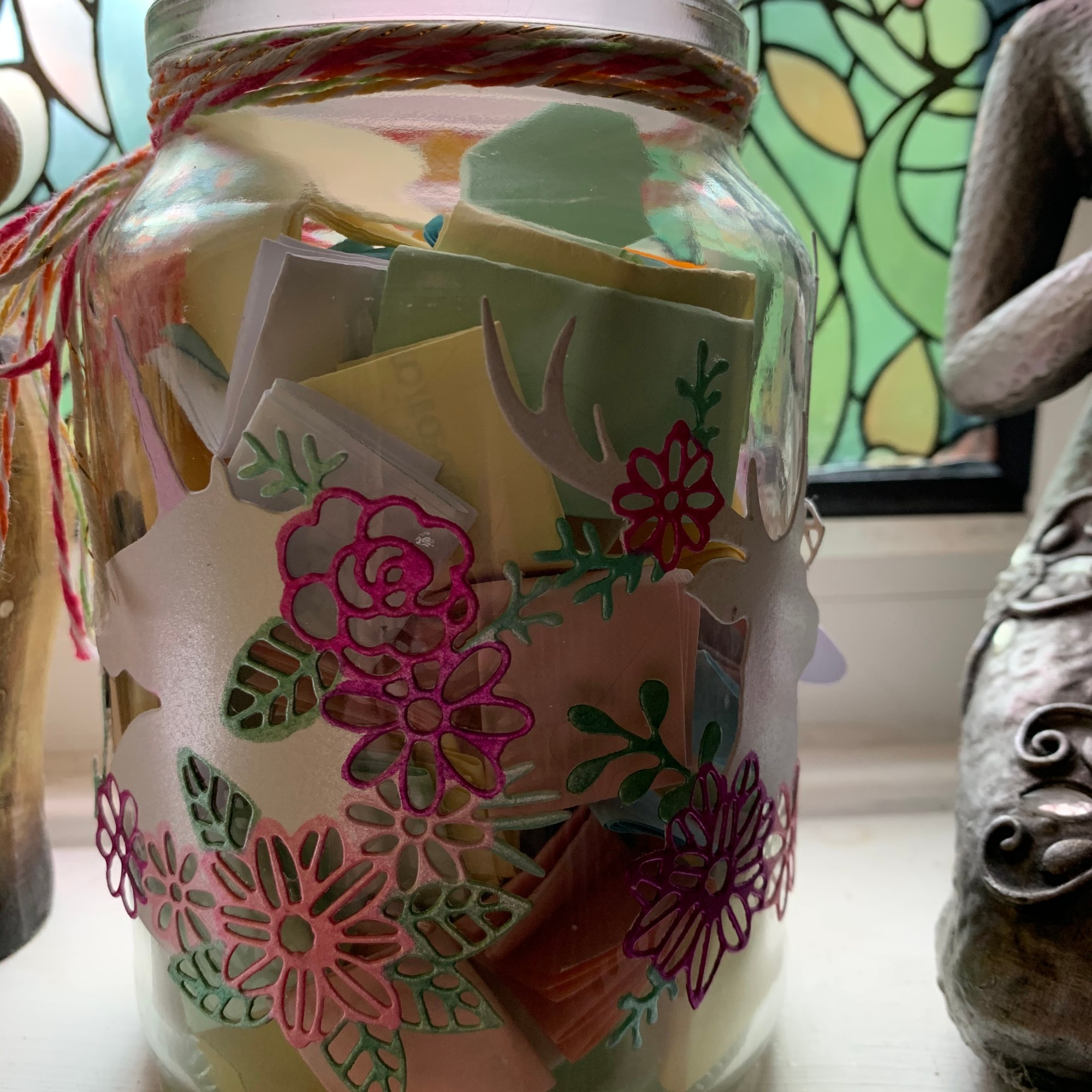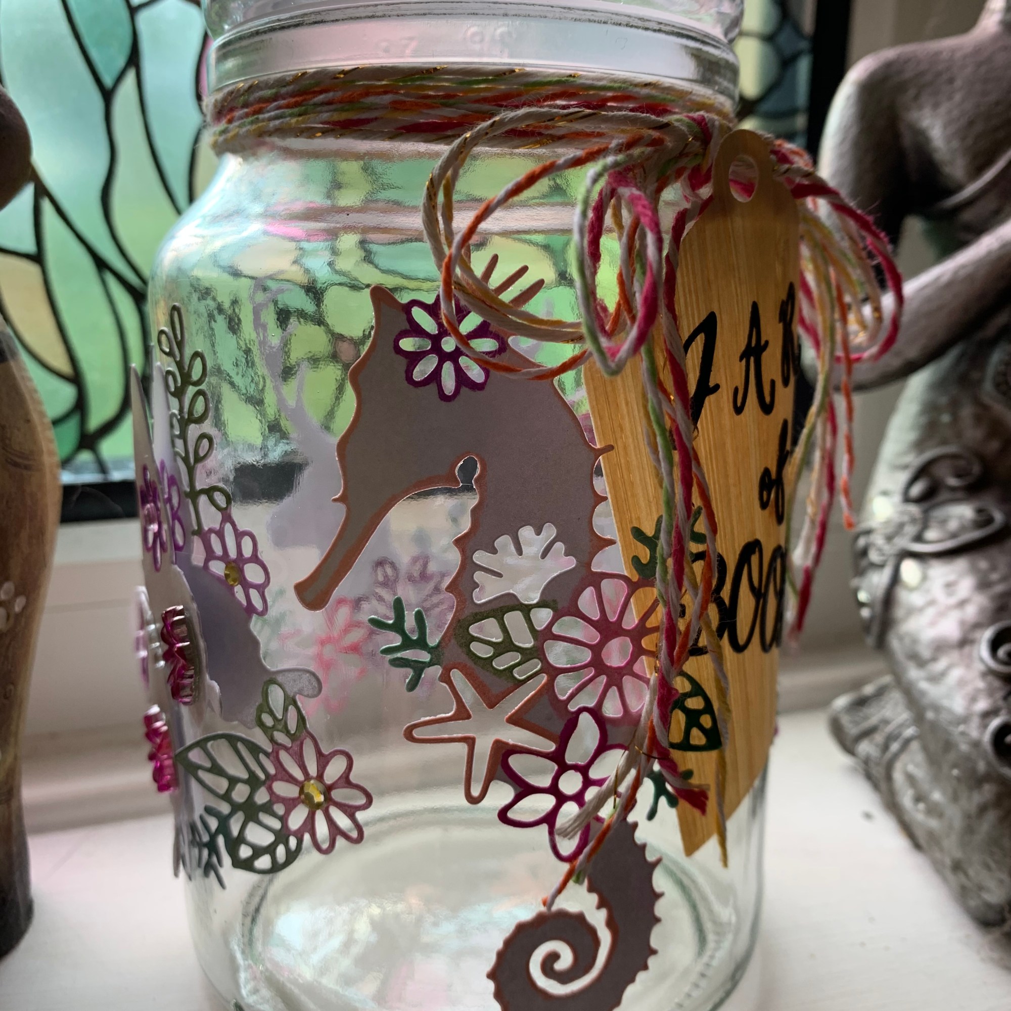 After printing out the 13 pages each containing 6 books and it’s information, I cut them all to size and then put them in to my NEW Jar of Books. I have gone for a bigger jar this time and I spent sometime decorating it. I have to say it’s taken me a few days to sort all of this out but I’m very pleased with the finished product.