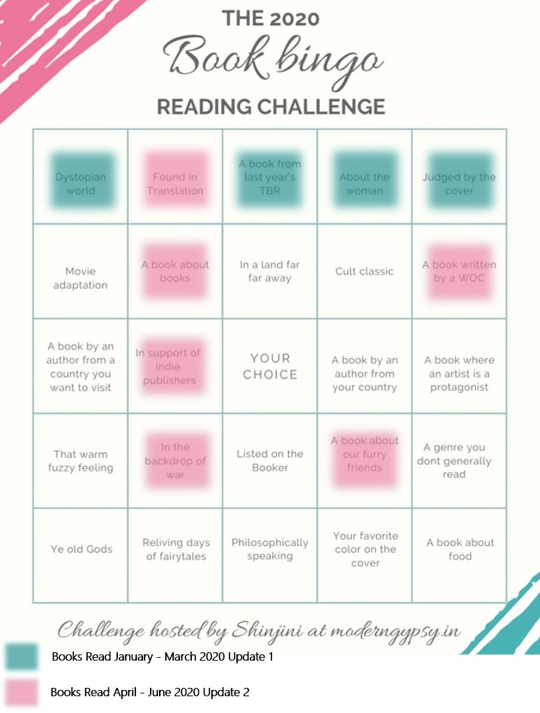 Well I should have posted this on 30 June 2020 but I forgot to actually post it. I guess late is better than never. It’s the second check in for the Modern Gypsy Book Bingo 2020’s Reading Challenge. I originally went for the top row on the bingo card below. You can see that I have highlighted in Turquoise what I managed to mark off the bingo card for the. If you want to see my first update and what books I read please follow the Link: Update 1